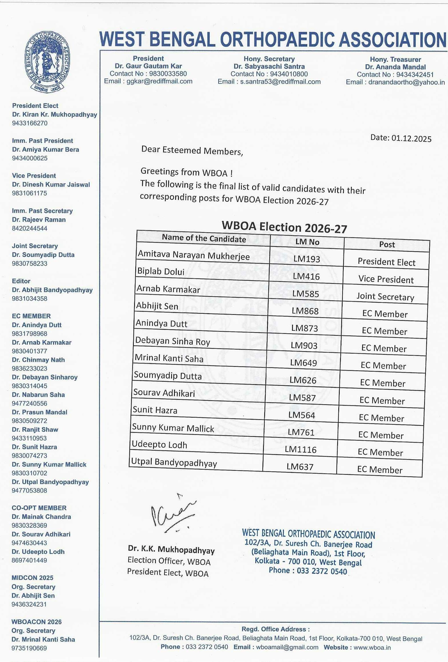 | 1 | Kiran Kumar Mukhopadhyay | LM-381 | President Elect |