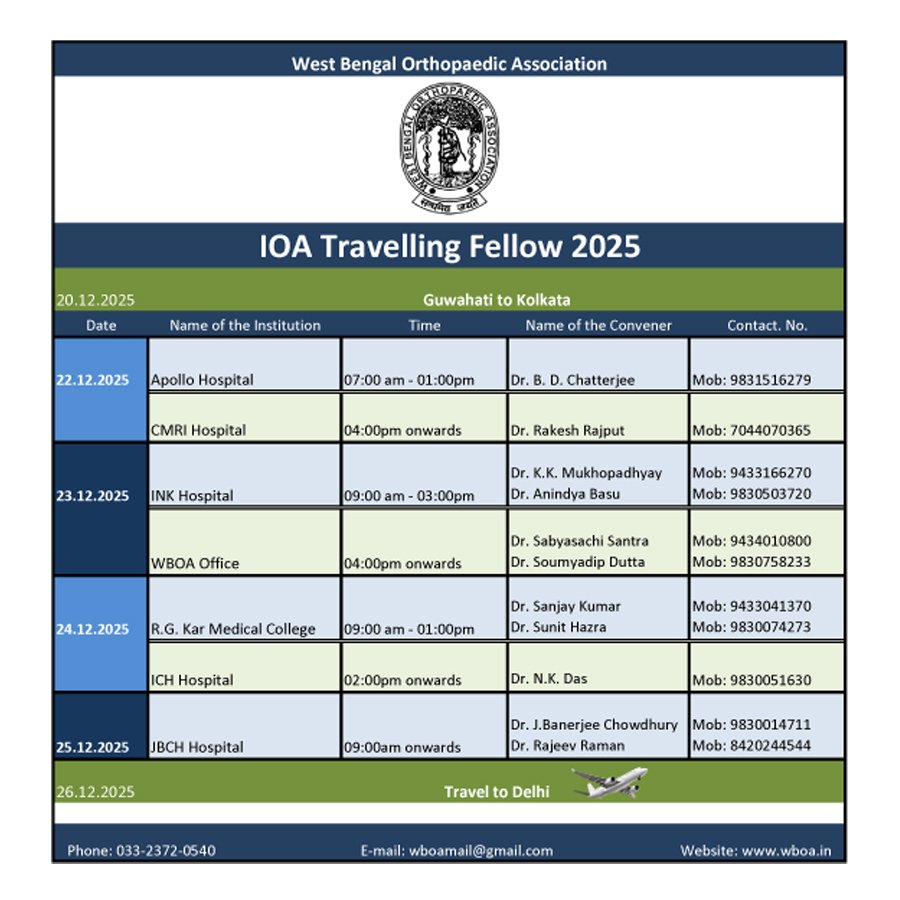 | WBOA Office | 04:00pm onwards | Dr. Sabyasachi Santra Dr. Soumyadip Dutta |